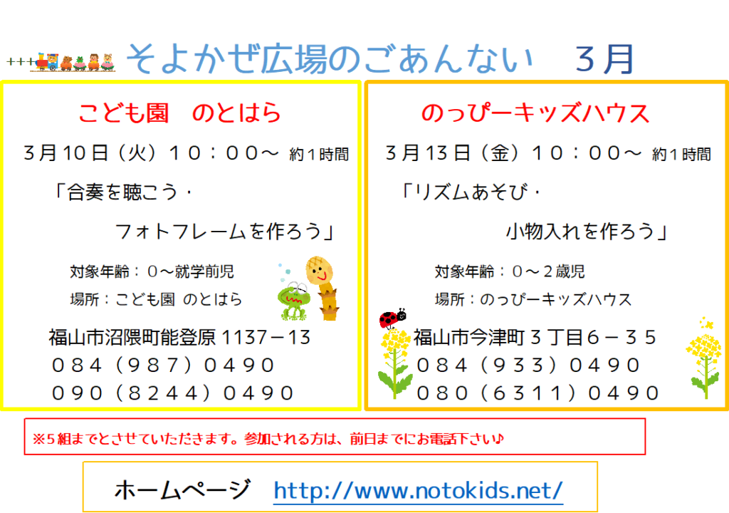 3月 こども園のとはら「合奏を聴こう・フォトフレームを作ろう」のっぴキッズハウス「リズム遊び・小物入れを作ろう」を開催
